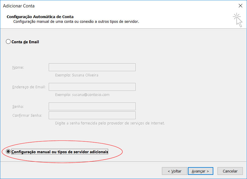 3- Na tela seguinte, marque a opção Configuração manual ou tipos de servidores adicionais e clique no botão Avançar.