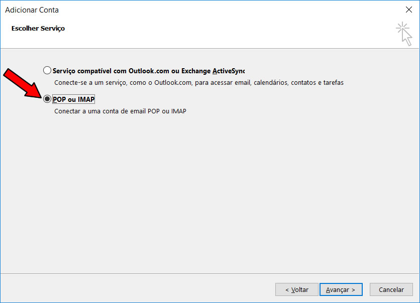 4- Na próxima tela, selecione a opção POP ou IMAP e clique no botão Avançar.
