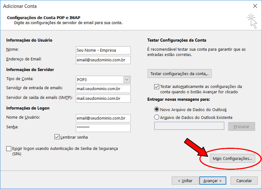 - Servidor de saída de emails (SMTP): digite mail.seudomínio.com.br