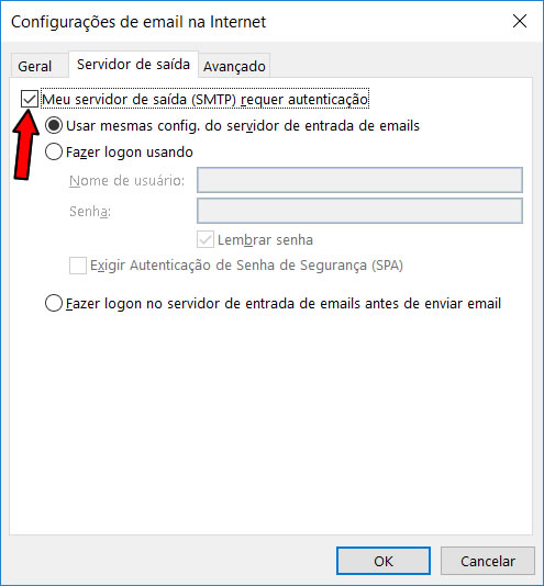 6- Na janela que abrir, clique na guia Servidor de saída e habilite a opção Meu servidor de saída (SMTP) requer autenticação e marque a opção Usar mesmas config. do servidor de entrada de emails.