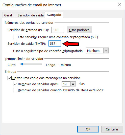 7- Depois, clique na guia Avançado e em servidor de entrada (POP3) digite 110 para POP ou 143 para IMAP. Logo abaixo, digite 26 para POP ou 587 para IMAP no campo Servidor de saída (SMTP), em seguida, clique em OK.