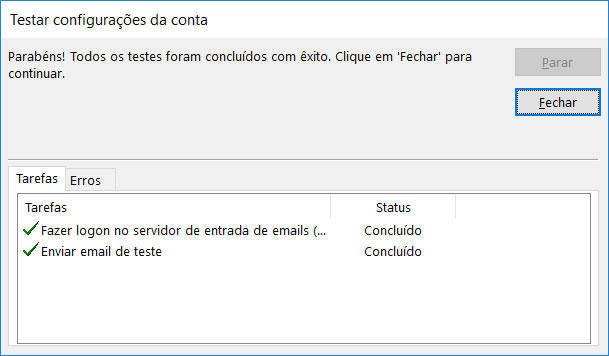 9- Se abrir a janela Testar configurações da conta, espere que as configurações sejam realizadas. Terminado as testes, clique no botão Fechar.