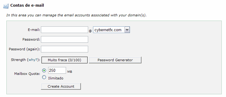 Uma conta principal padrão é criada automaticamente pelo sistema quando da abertura de sua conta de hospedagem. Esta conta terá o endereço username@seudomínio.com.br, etc. A senha será a mesma de seu cPanel.