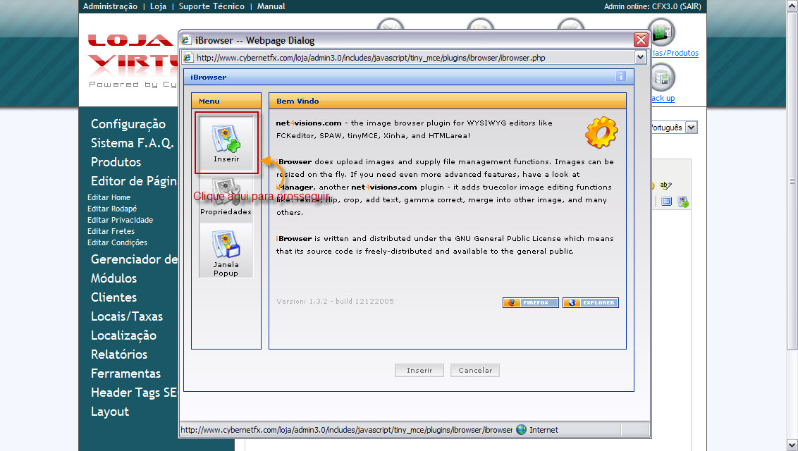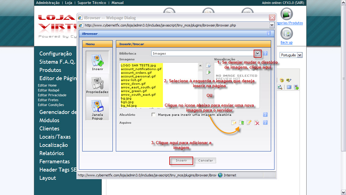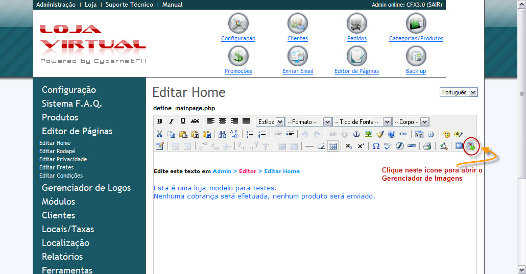 Primeiro, acesse o Editor de Páginas do menu da administração. Clique no link da página que deseja adicionar a imagem e siga as instruções abaixo: